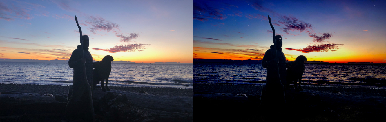 The next image is a photo of me and my dog, Hurley, that I just had some fun with, adding richness and drama to the colours, as well as sprinkling the sky with stars — and pretending my eyes are stars too!